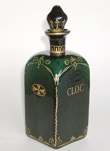 Likørkaraffel med glasprop, formet som en C.L.O.C. likørflaske. Dekoreret med guld og på to sider Malteserkors og to side med C.L.O.C.