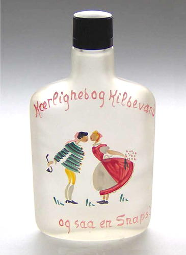 Matteret lommeflaske med sort skruelåg. Emaljemalet dekoration med kyssende par og teksten "Kærlighed og kildevand - og så en snaps!"