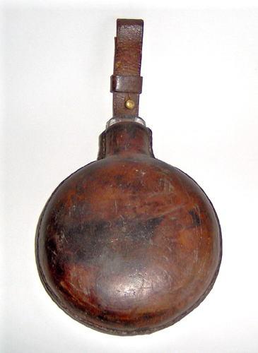 Rund, flad feltflaske i læderetui med øskner til bæresnor. Ifølge oplysninger fra Tøjhusmuseet brugt i den danske hær til ca. 1930. Angiveligt "Model 1856", i den viste udgave til rytteriet.