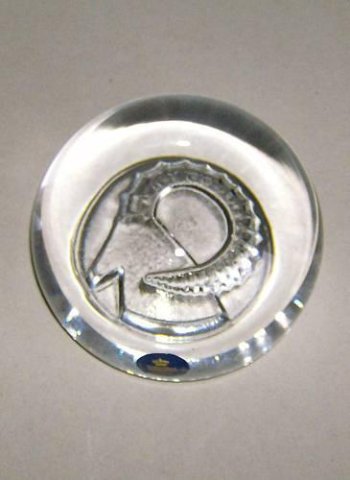 Flad rund brevpresser med indpresset stjernetegn "Stenbukken" i bunden. (23. december - 20. januar) Påsat blå Royal Copenhagen label.