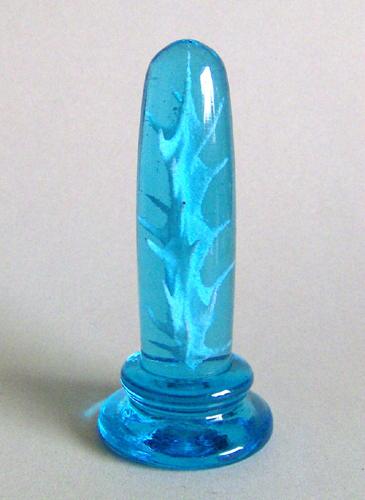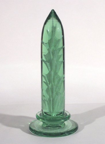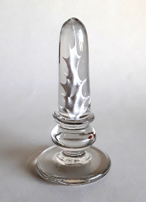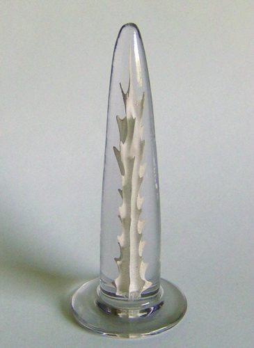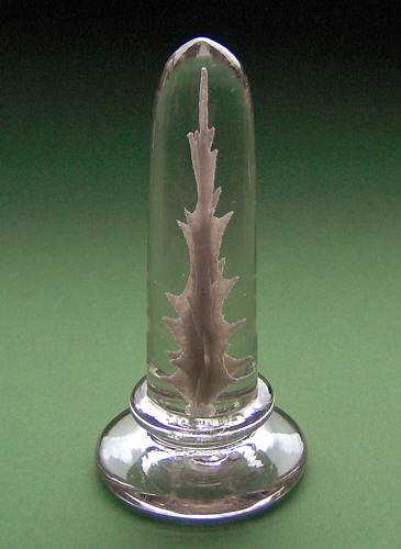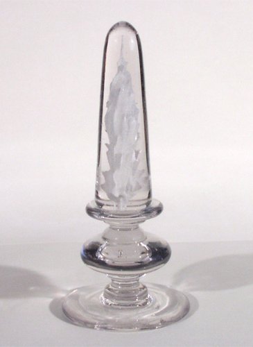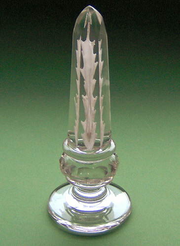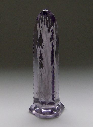 Sølvpyramide på lille fod, slebet sekskantet, med hakslibning på kanterne. Svagt violet tonet. Kuglet og planslebet bund.