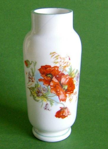 Vase af opalhvidt glas, med påbrændt overføringsbillede i emalje af blomsterbuket med valmuer. Afsprængt og slebet rand med grøn farve. Uden nr. i bunden.