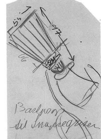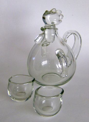 Karaffel udformet som en høne med hule vinger og hank. Proppen formet som "hønens" hoved. To tilhørende glas (kyllinger) med antydning af tud (næb).