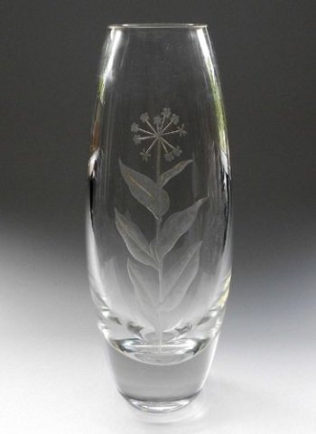 Slank elipseformet "Hellas" vase med planslebet rand og tyk bund. Kuglet i bund. På korpus graveret en tobaksplante, tegnet af Arne Bang.