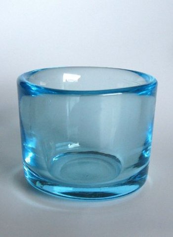 Cylindrisk krukke med "blød" rand og let afrundet bund, blæst i safirblåt glas. Kuglet i bund.