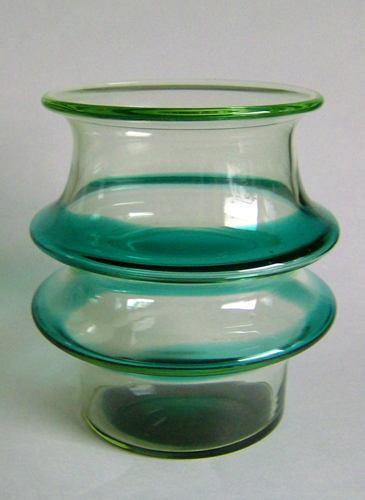 Vase/krukke med to store vulster og udsvajet rand, blæst i lyst labrador favet glas med solargrønne ringe og bund. Kuglet i bund. Fremstillet til separatudstilling på Den Permanente marts 1961.
