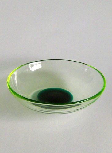 Lav skål, blæst i lyst urangrønt glas med solargrøn plet i bunden. Kuglet i bund.