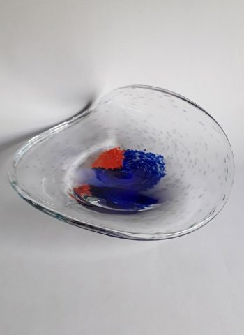 Stort fad blæst i klart glas med indlagte blå og orange skår i midten samt grønne "fnug" i hele faddet. Plansleben bund og foldet side.