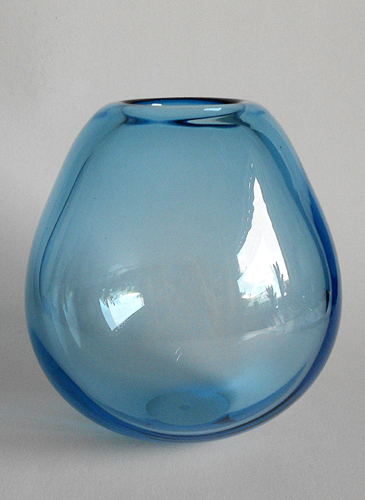 Kraftig dråbeformet vase blæst i søblåt glas. Planslebet bund. LP tegning nr. 4828 - 22.11. 1993