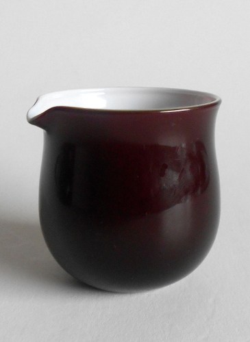 1/2 liter kande med påsat hank, fra serien "Køkken & Bord", blæst i hvidt opalglas med aubergine farvet overfang.