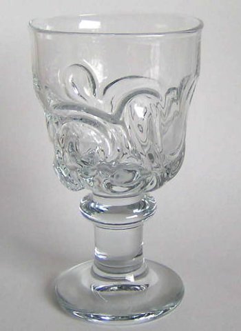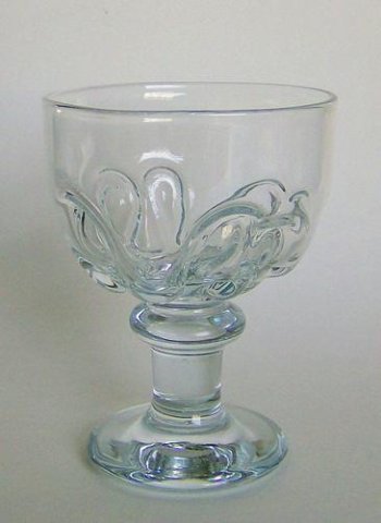Kraftigt vinglas med stærkt mønstret underdel af kummen, og med stor rund knap på stilken. Fra jubilæumsservicet "Banquet" lavet i anledning af Holmegaards 150 års jubilæum.