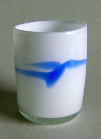 Cylindrisk bæger med afrundet bund, blæst i opalhvidt glas med indlagt blå stribe, og overfang af klart krystalglas.