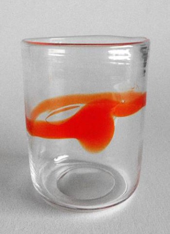 Cylinderformet bæger med afrundet bund, blæst i klart glas med indlagt orange stribe. Kuglet i bund.