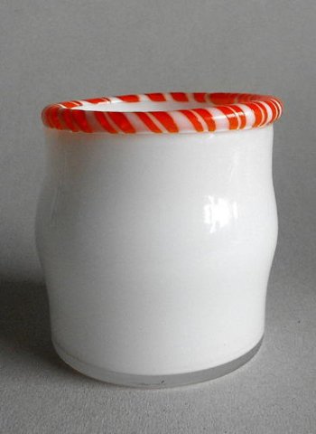 Lille bæger der svajer ud på midten, blæst i opalhvidt glas med klart overfang, randen pålagt en ring af orangefarvede striber. Kuglet i bund.