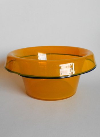Konisk skål med flad bund og udkrænget krave, blæst i gulorange transparent glas med pålagt mørkeblå rand. Anhæftet med stor sandnavle.
