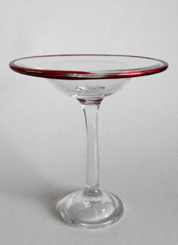Konfektskål på høj tynd stilk, blæst i klart krystalglas og randen pålagt aubergine farvet kant. Kuglet i bund. (Skålen er fremstillet til udstilling i Østergade, København.)