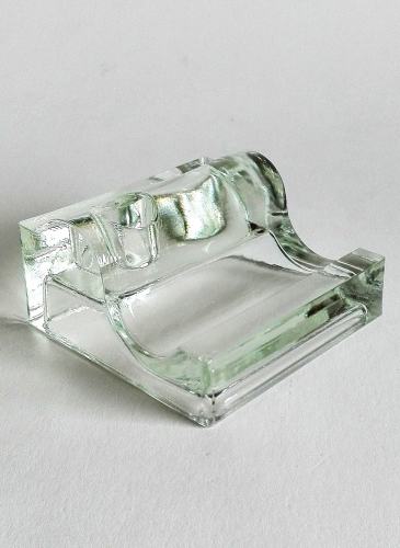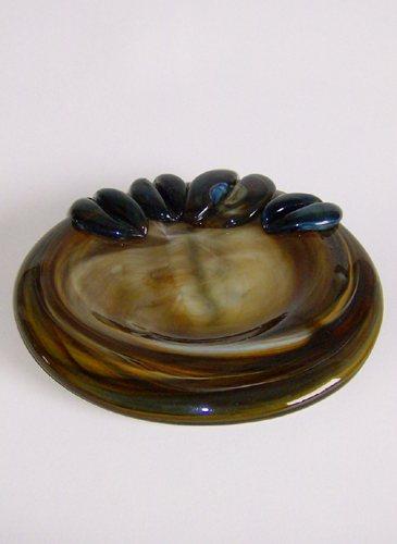 Askebæger blæst i brunmeleret marmoreret glas, fladt med afrundet, ophøjet rand og sænket på midten. På randen påsat fire læbeformede holdere til cigarer eller cigaretter.