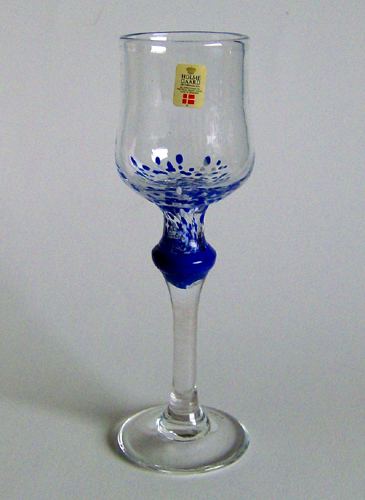 Drikkeglas på høj stilk og indlagte blå og hvide klatter i bunden af kummen og det øverste af stilken. Påsat label med nr. 41