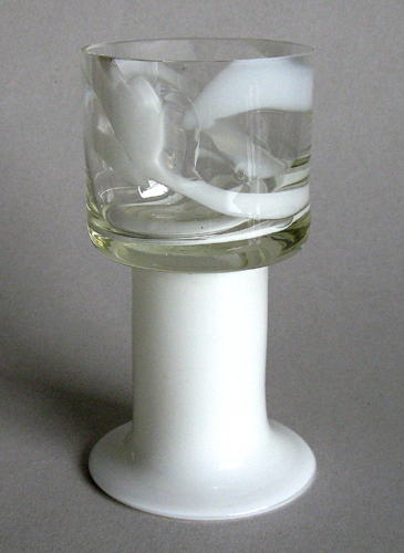Cylindrisk drikkeglas med klar kumme, på kraftig hul opalhvid fod. I kummen indlagt opalhvide skår. Randen slebet.