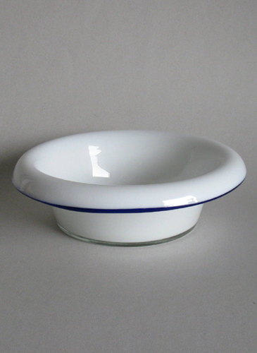 Lav skål med udkrænget krave, blæst i opalhvidt glas med pålagt blå rand, samt overfang i klart glas. Anhæftet med stor sandnavle.
