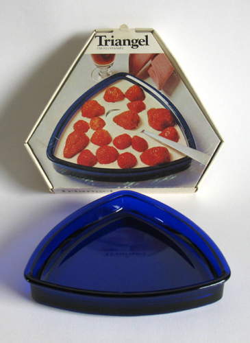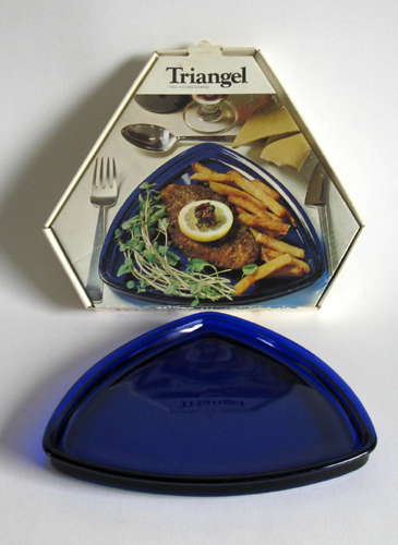 Maskinblæst trekantet flad tallerken med tilhørende æske, fra husholdningsserien "Triangel". I bunden "MADE IN DENMARK PAT. PENO."