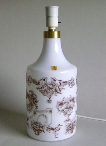 Cylindrisk "Poesi" bordlampe med skulder og indsnævring til hals, monteret med messingkrave. Blæst i hvidt opalglas med klart overfang. Dekoreret med stregtegninger i brun farve.