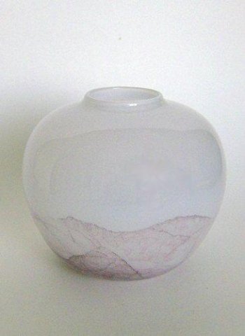 Næsten kugleformet opalhvid vase fra serien "Jasmin" med lille halsrand, dekoreret med abstrakt bjerg landskabs motiv i gammelrosa farve.