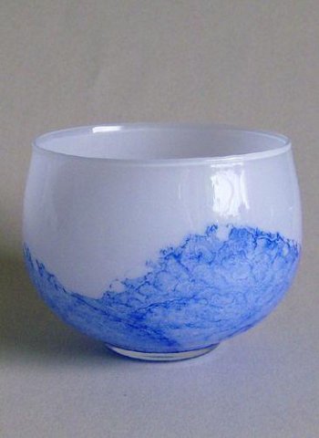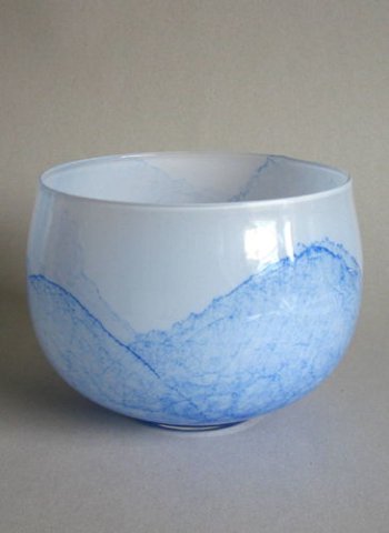 Halvkugleformet skål fra serien "Jasmin" med lille stårand, i opalglas med klart krystal overfang. Dekoreret med abstrakt bjerg landskabs motiv i blå farve.