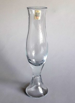 Lile balusterformet vase på lille trompetformet fod, blæst i klart glas. Påsat Dannebrogs label nr. 285