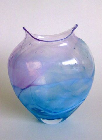 Sammenklemt vase med to spidser i siderne, og lille rund planslebet ståflade, blæst i klart glas med indlagte lyseblå og pinkfarvede "skyer" og partier.