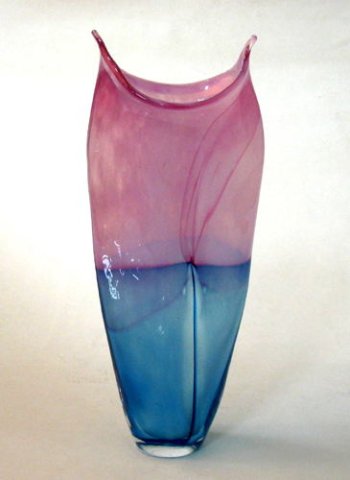Høj sammenklemt vase fra serien "Cumulus" med to spidser i siderne, og lille rund planslebet ståflade, blæst i klart glas med indlagte rosa og blå "skyer".