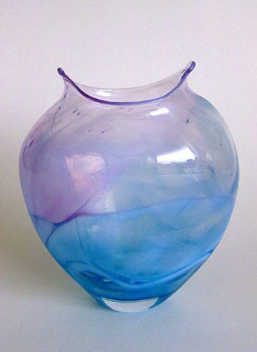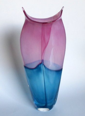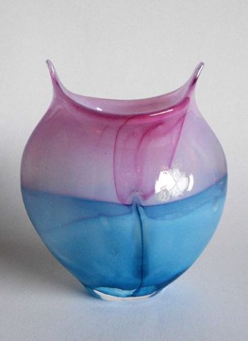 Lav sammenklemt vase fra serien "Cumulus" med to spidser i siderne, og lille rund planslebet ståflade, blæst i klart glas med indlagte lyseblå og pink farvede "skyer" og partier.