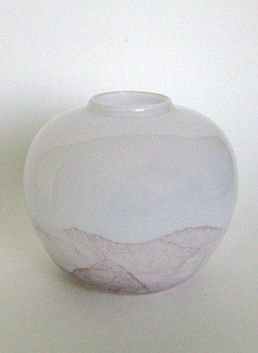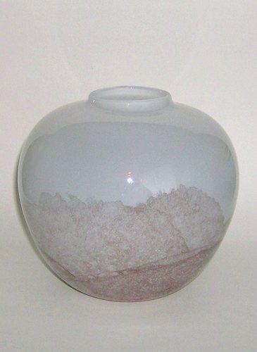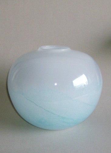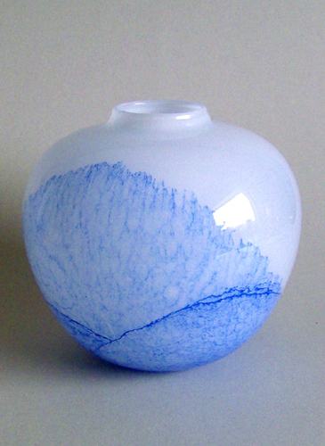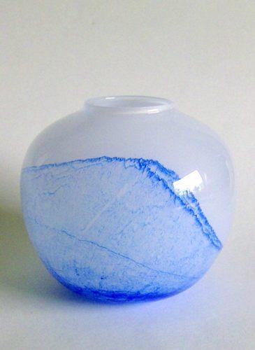 Mellemstor, næsten kugleformet vase med lille halsrand, i opalhvid med klart krystal overfang. Dekoreret med abstrakt landskabs motiv i blå farve. Fra serien "Jasmin"