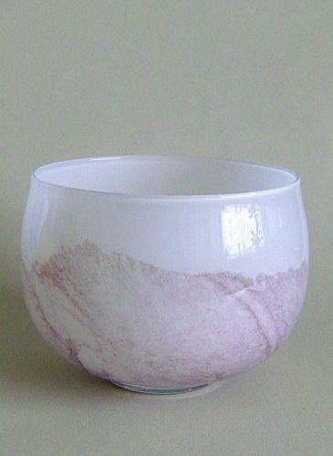 Halvkugleformet skål fra serien "Jasmin" med lille stårand, i opalglas med klart krystal overfang. Dekoreret med abstrakt bjerg landskabs motiv i gammelrosa farve.