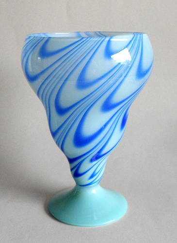 Stor profileret vase blæst i tonet opalglas i farverne lyseblå og lysegrøn, med indlagte blå bølgede striber.