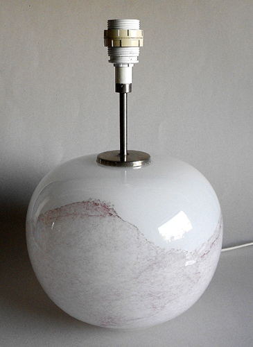Kugleformet bordlampe fra serien "Jasmin" blæst i opalglas med klart krystal overfang. Dekoreret med abstrakt bjerglandskabs motiv i rosa farve. Monteret med rustfrit stål og fatning.