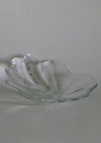 Stort centrifugeret fad fra serien "Natura" i klart krystalglas, formet som et stort tunget blad.