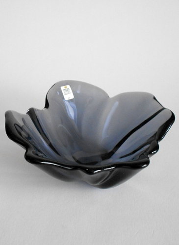 Lille gråviolet centrifugeret krystalskål fra serien "Natura" formet som et abstrakt blad. Påsat Dannebrogs label med nr. 388