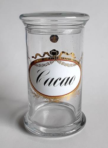 Stort cylinderformet glas med massiv fodrand og tilhørende låg, blæst i urent glas. På korpus hvid emalje oval med guldbort om. I ovalen "Cacao" med sort skrift. Påsat blå Royal Copenhagen label.