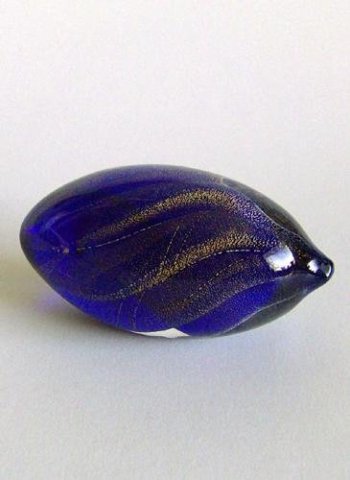 Massiv brevpresser formet som et æg med spidse ender, i violblåt glas med guldstøv der er vredet, og klart krystal overfang. Planslebet bund.