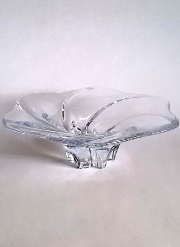 Kraftig centrifugeret krystalfad, vredet så det danner 6 tunger, stående på seksfløjet planslebet fod.