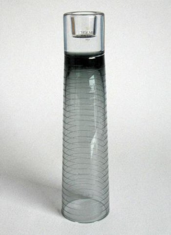 Lysestage eller vase blæst i smoke farvet glas med slebet spiralmønster. Påsat HOLMEGAARD 1825 label.