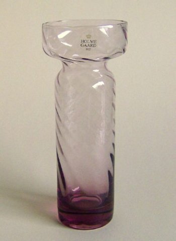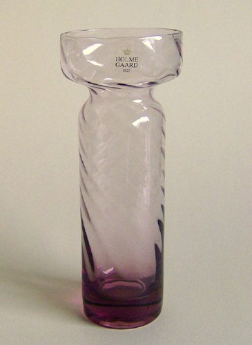 Hyacintglas med skålformet overdel, blæst med snoet optik i svagt rosafarvet glas. Påsat Holmegaard 1825 label.