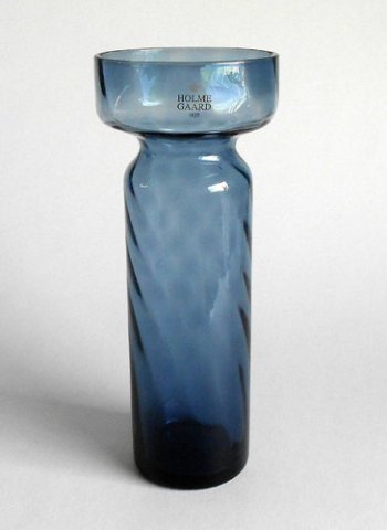 Hyacintglas med skålformet overdel, blæst med snoet optik i transparent blåt glas. Påsat Holmegaard 1825 label.