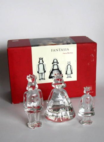 Tre mini glasskulpturer i form af en konge, en dronning og en lille prins. Figurerne vist med original æske.