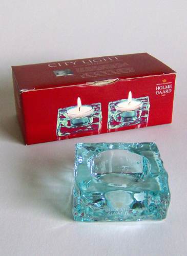 To flade firkantede fyrfads lysestager fra serien "City Light", formet som brosten med hul til lys, stagerne er støbt i aquablåt krystalglas. Påsat HOLMEGAARD 1825 label.