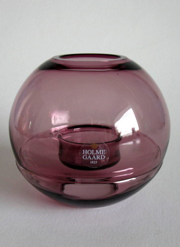 Stor todelt kugleformet fyrfadsstage med planslebet top og bund, blæst i transparent violet glas. Påsat HOLMEGAARD 1825 label.