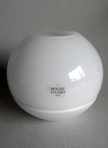 Stor todelt kugleformet fyrfadsstage med planslebet top og bund, blæst i hvidt opalglas med klart overfang. Påsat HOLMEGAARD 1825 label.