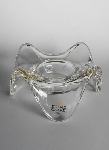 Fyrfadsstage på fire ombukkede flige så de danner fødder. Påsat HOLMEGAARD 1825 label.