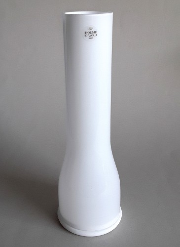 Høj smal Hurricane stage fra serien "Light Bottle" blæst i opalhvidt glas, med løs fod af opalhvidt glas. Påsat Holmegaard 1825 label.